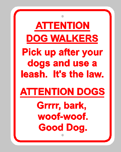Sign Details: Metal Sign ..080 Aluminum; Color Red letters on white background; Size R or NR18″ x 24″ R; Desired Fonts and Text Arial Bold; centered. Words in CAPS should be underlined. ATTENTION DOG WALKERS Pick up after your dogs and use a leash. It’s the law. ATTENTION DOGS Grrrr; bark; woof-woof. Good Dog.
