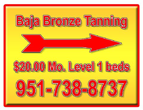 Size 18 inches by 24 inches; Color yellow backround; red lettering; Desired Fonts and Text desired font- arial bold Baja Bronze Tanning (with an arrow pointing to the right) $20.00 Mo. Level 1 beds 951-738-8737