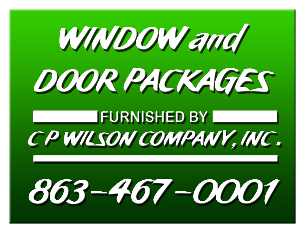 Type of Sign Custom Yard Sign; Size 18×24 2 sided Sign Colors FOREST GREEN SIGN WITH WHITE LETTERS; Desired Fonts and Text 34 FAT CAT FONT… WINDOW and DOOR PACKAGES FURNISHED BY C P WILSON COMPANY; INC. 863-467-0001 ANY QUESTIONS PLEASE CALL CAN YOU EMAIL OR FAX ARTWORK BEFORE DOING SIGN