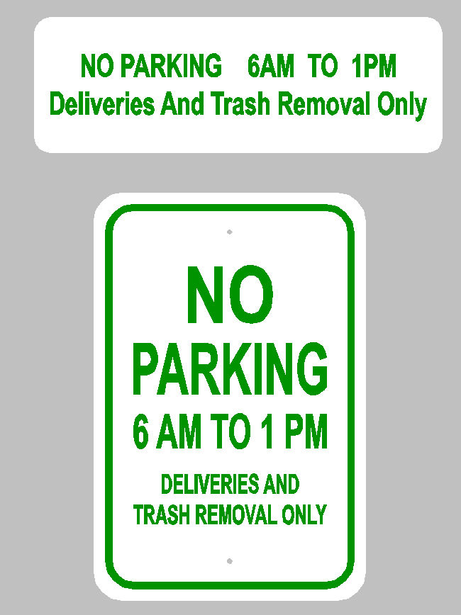 Type_of_Sign: 6 x 18 Color: White/green writing Size_R_or_NR: NR Desired_Fonts_and_Text: Arial Bold No Parking 6 A.M. To 1 P.M. Deliveries And Trash Removal Only