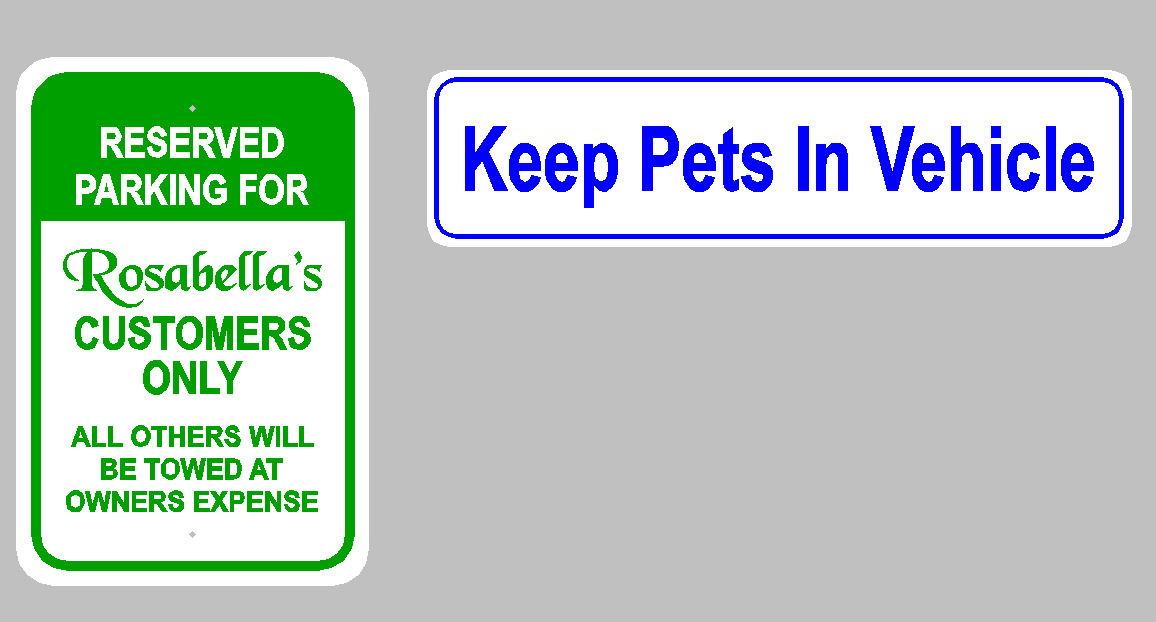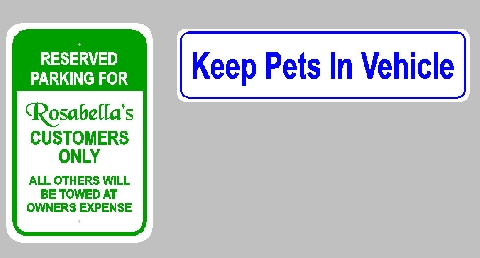 Metal Sign Options = Vinyl Worded 063 Aluminum, Type_of_Sign: Reserved Parking, Size_R_or_NR: R, 2-Color: Apple Green, Price: 28.20 each, 4-Desired_Fonts_and_Text: Reserved Parking for Rosabella`s Customers Only All others will be towed at owners expense