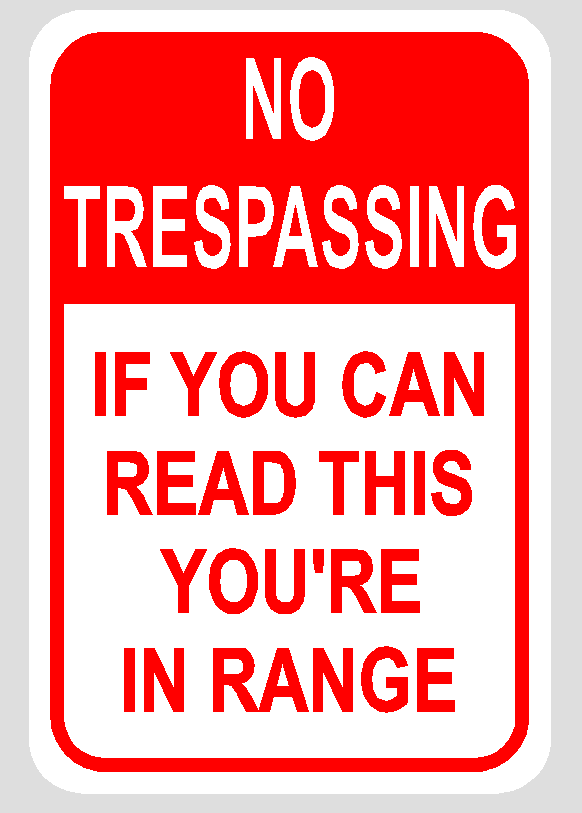 Sign Details-Type of Sign custom metal, Color white/red, Size R or NR 12×18 R; Desired Fonts and Text Arial bold; upper case. White and red sign to look like legitimate parking or trespassing sign. Upper third red background with white lettering like the “house director” example in the journal. Upper portion; big white letters on red background: NO TRESPASSING lower portion IF YOU CAN smaller READ THIS; red letters YOU’RE on white PROBABLY background IN RANGE