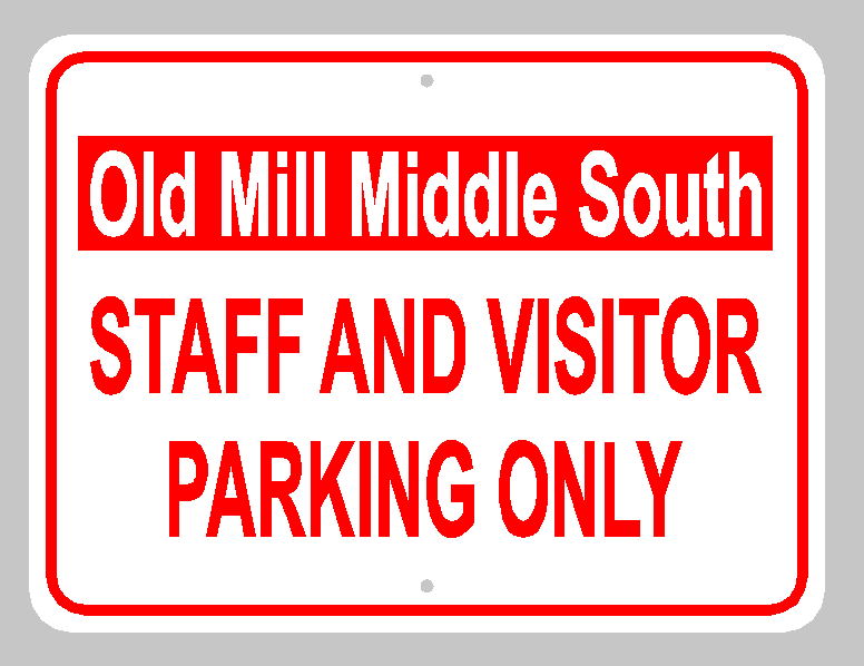 Sign Details: Type of Sign .080 Aluminum; Color White back/Red lettering; Size R or NR 18″x24″ NR; Desired Fonts and Text Make the sign 24″ in width (left to right) Block lettering Text as follows: Old Mill Middle South Staff and Visitor Parking Only shown against gray background