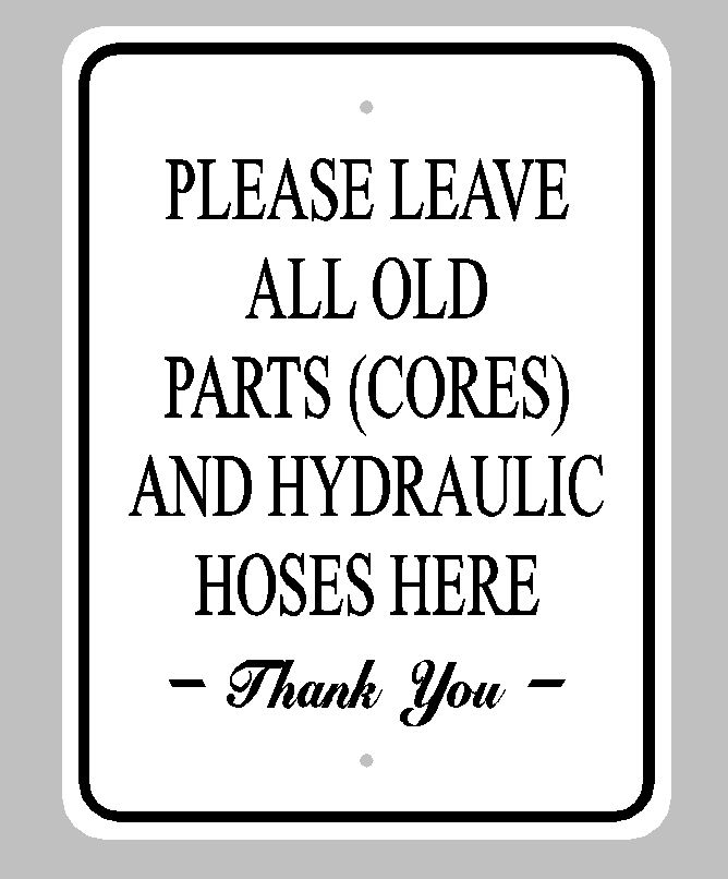 Type of Sign18 x 24; Color white; Size R or NR NR; Desired Fonts and TextTimes roman font I would like the sign to be laid out with the 24 inch sides as the top and bottom. Lettering would be as follows: Please leave all old parts (cores) and Hydraulic hoses HERE. Thank you. lettering can be in black;