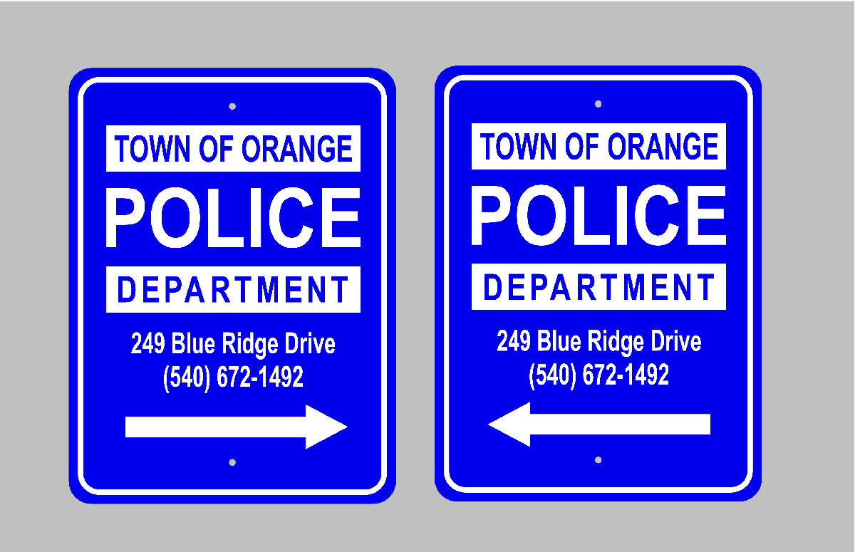 Type of Sign traffic sign metal; Color blue with white letters; Size R or NR18x24 R; Desired Fonts and Text Boroughs font for all; white letters TOWN OF ORANGE POLICE <—–all caps; larger size DEPARTMENT 249 Blue Ridge Drive <—smaller than above (540) 672-1491 (I would like to have one white arrow underneath the text on each sign; on one pointing to the right; pointing to the left on the other. These signs will be used to direct both lanes of travel to the police department.;