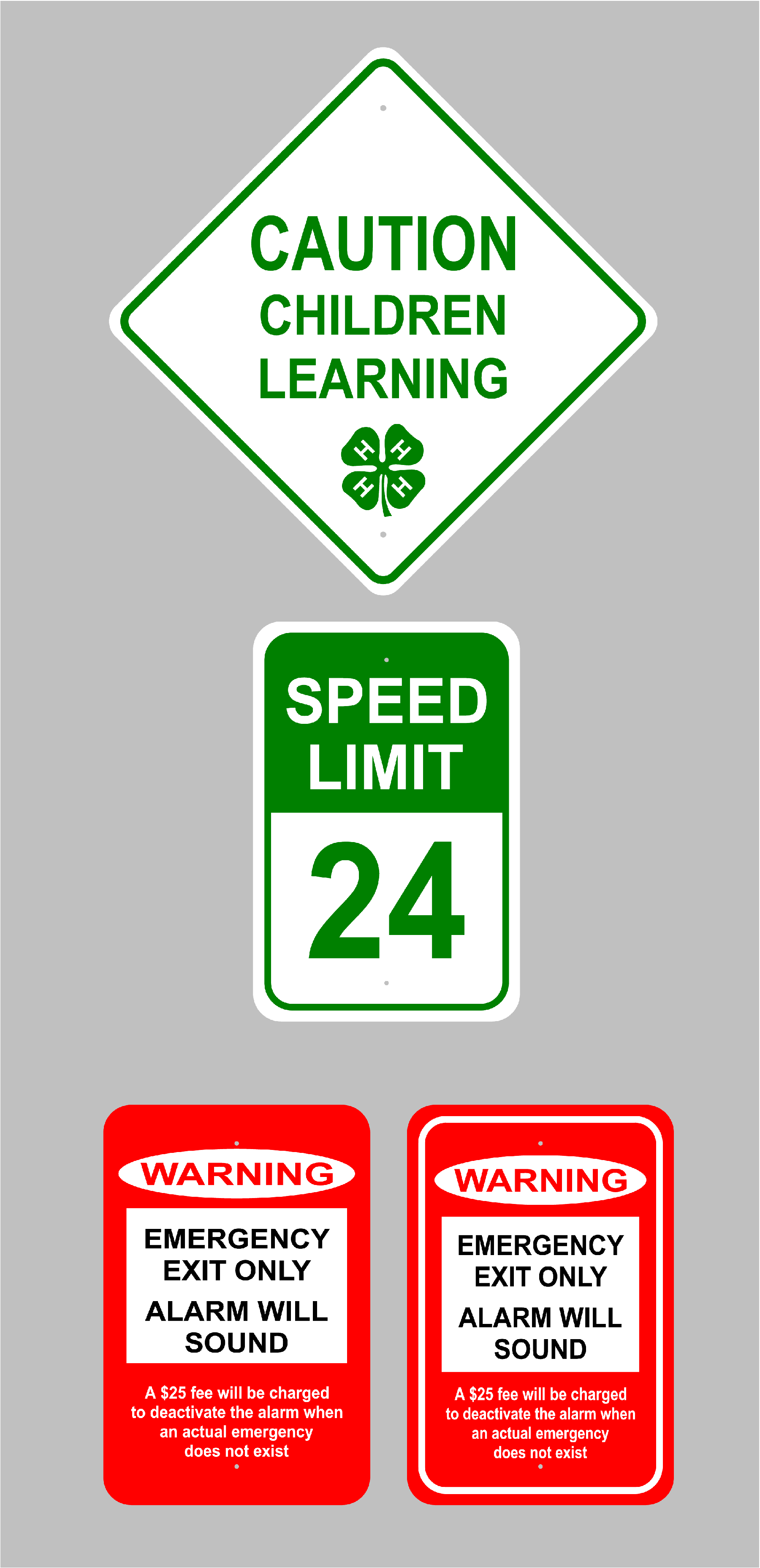 Hello. Thanks again for your recent order. Attached you will notice a layout for your sign idea. Let me know what you think. Keep in mind monitors vary GREATLY in the way they display colors. Your order will be made in the Pantone color requested. The speed limit sample speed will be adjusted to 34, 44 on 5 and 7 signs respectively. Also, you’ll notice two layouts on the WARNING sign. Let me know which you prefer. Once we get the final go ahead your signs will mail within the time frame Kayla mentioned. If you have any questions let me know.