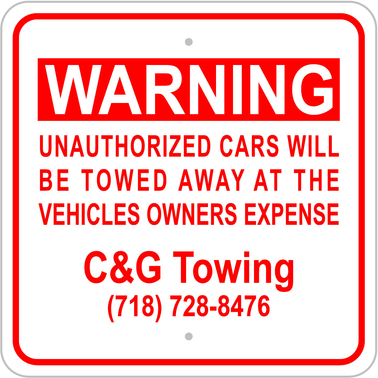 18×18 Red Text Font-Arial WARNING: UNAUTHORIZED CARS WILL BE TOWED AWAY AT THE VEHICLE OWNERS EXPENSE C&G Towing 718-728-8476