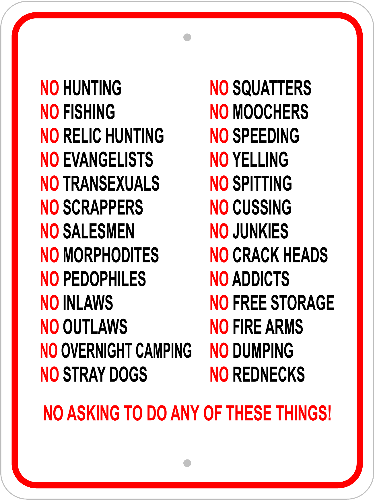 Metal Sign Options = Type of Sign 18″ x 24″; Color WHITE; Size R or NRR; Desired Fonts and Text NO HUNTING NO FISHING NO RELIC HUNTING NO EVANGELISTS NO TRANSEXUALS NO SCRAPPERS NO SALESMEN NO MORPHODITES NO PEDOPHILES NO INLAWS NO OUTLAWS NO OVERNIGHT CAMPING NO STRAY DOGS NO SQUATTERS NO MOOCHERS NO SPEEDING NO YELLING NO SPITTING NO CUSSING NO JUNKIES NO CRACK HEADS NO ADDICTS NO FREE STORAGE NO FIRE ARMS NO DUMPING NO REDNECKS NO ASKING TO DO ANY OF THESE THINGS! ;