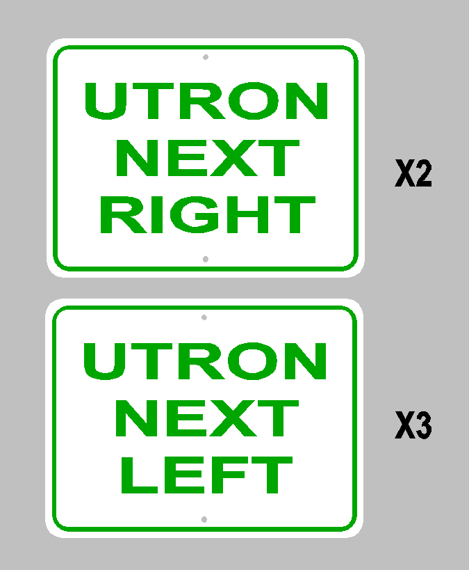 Type of Sign Traffic; Color Green; Size R or NR 18″ x 24″ R; Desired Fonts and Text Font Arial Bold Text UTRON NEXT LEFT Type of Sign Traffic; Color Green; Size R or NR 18″ x 24″ R; Desired Fonts and Text Font Arial Bold Text UTRON NEXT RIGHT