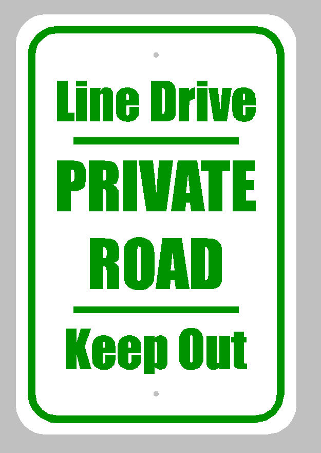 Type of Sign aluminum; Color forest green; Size R or NR reflective; Desired Fonts and Text font- Impact or Helvetica bold; centered; with short 2 pt. line separating line drive; private road; keep out. Private road should be 2-3 pt. sizes larger than other type Line Drive PRIVATE ROAD Keep out;