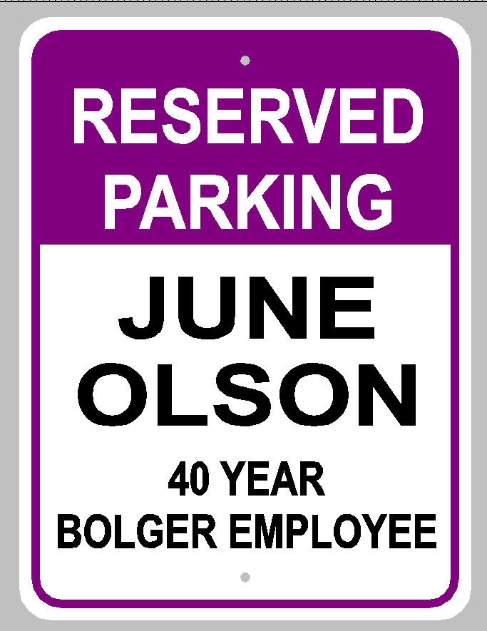 Type of Sign Aluminum; Color White Background; Size R or NR 18×24 NR; Desired Fonts and Text RESERVED PARKING (with border all around) all caps in purple JUNE OLSON (name bigger than next two lines) 40 YEAR BOLGER EMPLOYEE (all caps in black) Arial Bold Font – All Upper Case