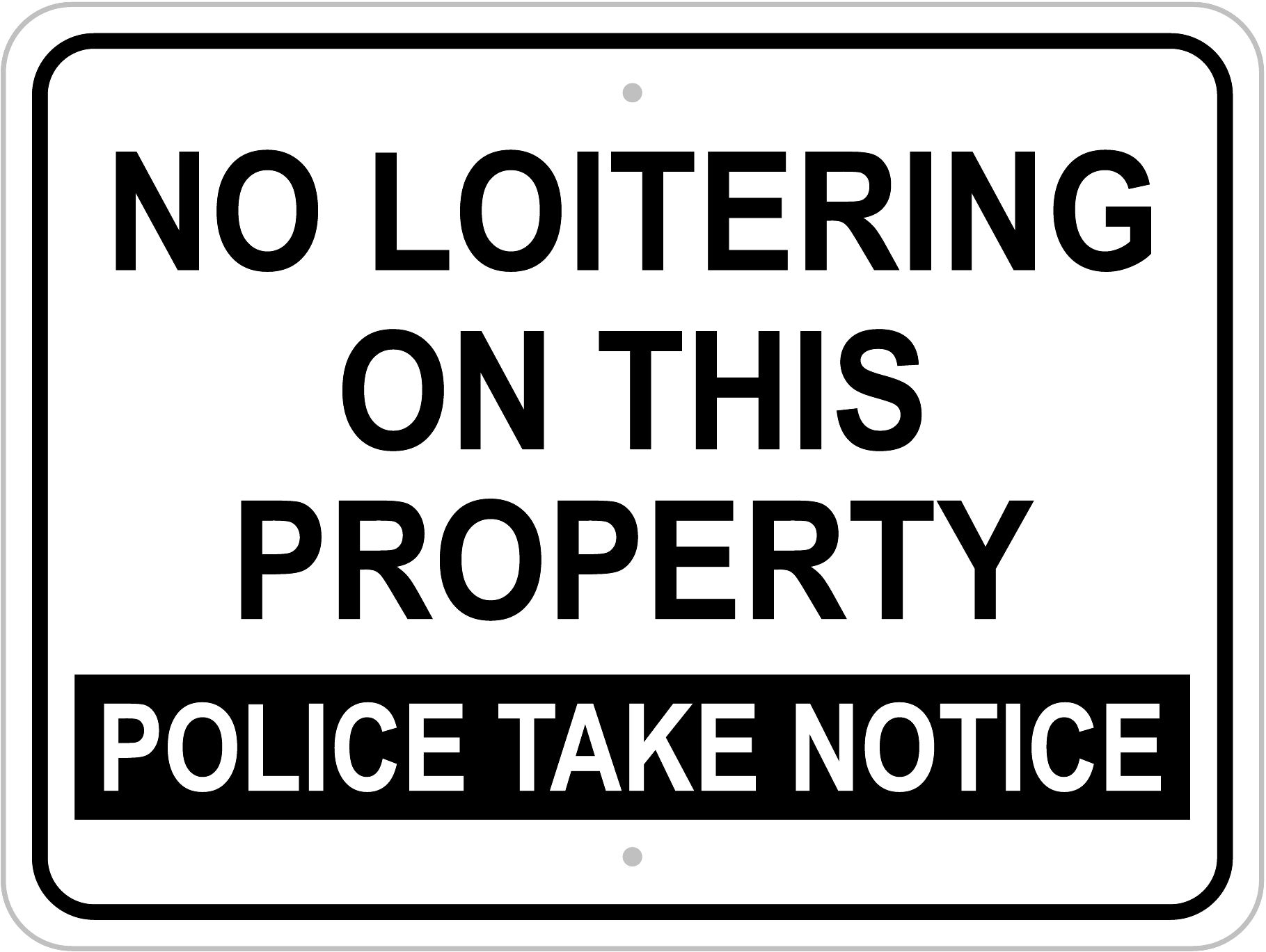 Type of Sign 18″ x 24″; Color white; Desired Fonts and Text large black letters “NO LOITERING ON THIS PROPERTY POLICE TAKE NOTICE”