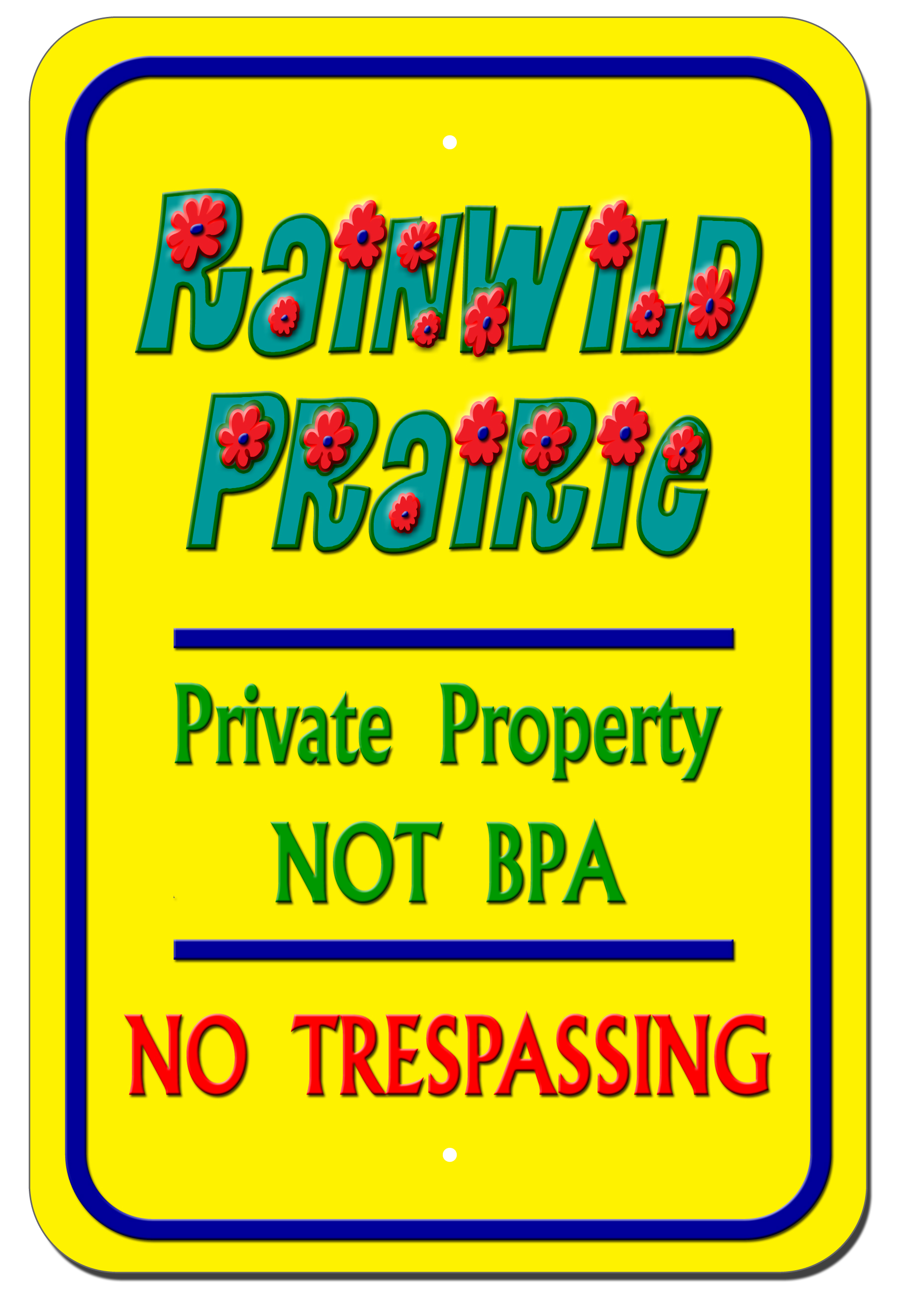 Type of Sign Parking; Color Yellow ; Size R or NR 12h x 18w; Desired Fonts and Text Rainwild Prairie (font Flower Power; colorTeal) (horizontal line; navy blue) Private Property — NOT BPA (fontFlair; color green; a little smaller than the top and bottom fonts) (horizontal line; navy blue) NO TRESPASSING (fontFlair; color red; same size as the top font);