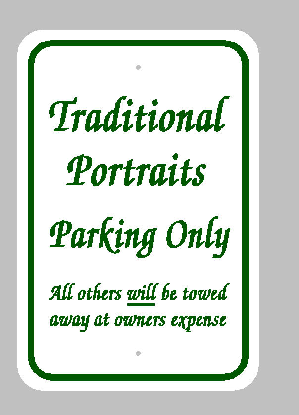 Type of Sign 12×18; Color white (cream) and forest green; Size R or NR nr; Desired Fonts and Text Zapf Chancery Traditional Portraits parking only. All others will be towed away at owners expence. (make all font forest green and underline will);