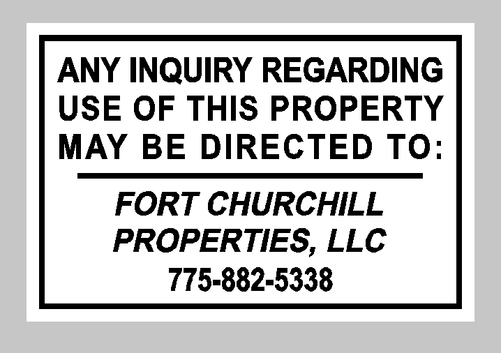 Sign Details: Corrugated Plastic Yard Sign Size12 inch by 18 inches; Color white with black lettering; Desired Fonts and Text Aerial Bold ANY INQUIRY REGARDING USE OF THIS PROPERTY MAY BE DIRECTED TO: FORT CHURCHILL PROPERTIES; LLC 775-882-5338