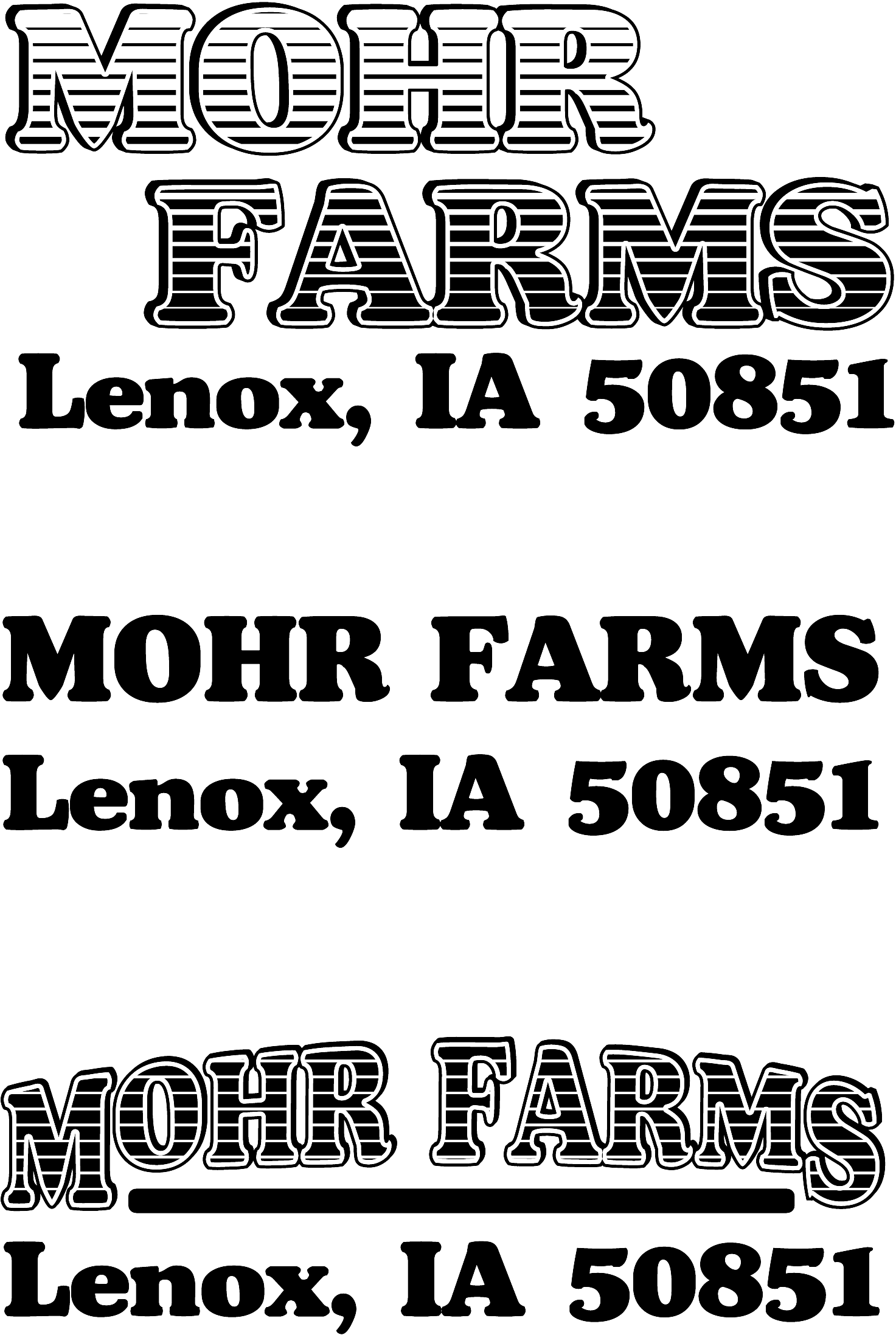 Type of Lettering: Semi truck door; Size 12″ h x 20″ w; Colors Black; Desired Fonts and Text Font #15 Broadside MOHR FARMS Lenox; IA 50851 MOHR FARMS in all caps on the first line and as wide as the 2nd line which will be Lenox; IA 50851. We want both lines to be the same width. This will make MOHR FARMS stand out more than the 2nd line.