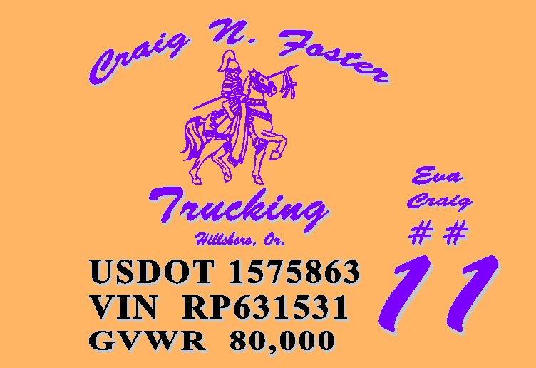 Lettering Details: Size 24″;W x 30″H; Colors Royal Purple (primary color) 2 additional colors; Desired Fonts and Text Craig N.Foster picture of knight on horse 2nl.jpg Trucking Hillsboro; Or. USDOT 1575863 VIN RP631531 GVWR 80; 000