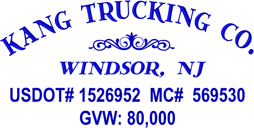 Sign Details: Custom Truck Lettering; Size 10×20; Colors Blue; Desired Fonts and Text font Romana sign KANG TRUCKING COMPANY EAST WINDSOR; NJ USDOT #1526952 MC #569530 GVW 80,000