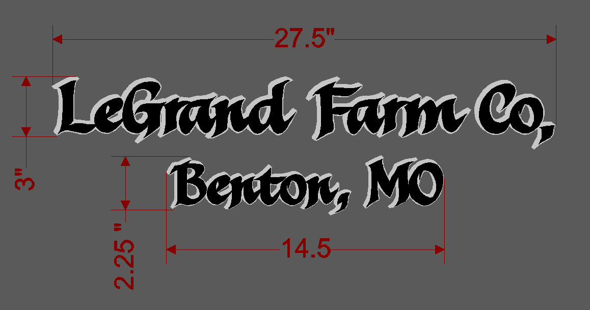 Sign Details: Truck Lettering; Size 8×28; Colors Black Letters with Silver or Chrome Shadow; Desired Fonts and Text LeGrand Farm Co. Benton; MO Font Harvest Black lettering with chrome or silver upper left shadowing on charcoal truck Letters sizing should be something like the following: The L; G; d; F; C in LeGrand Farm Co. should be 2-3 inches (the truck we measured from had 2 3/4″ letters. The e; r; a; n; d; … should be about 2″ depending on the size of the letters above (again; this was what it measured on a similar truck) The B and M in Benton Missouri measure 2″ and the other letters measure 1 1/2″. The length of LeGrand Farm Co. should be no longer than 28 inches. The length of Benton; MO should be no longer than 15″ Please call me with any questions at 573-382-0283. I emailed this information earlier today as well.