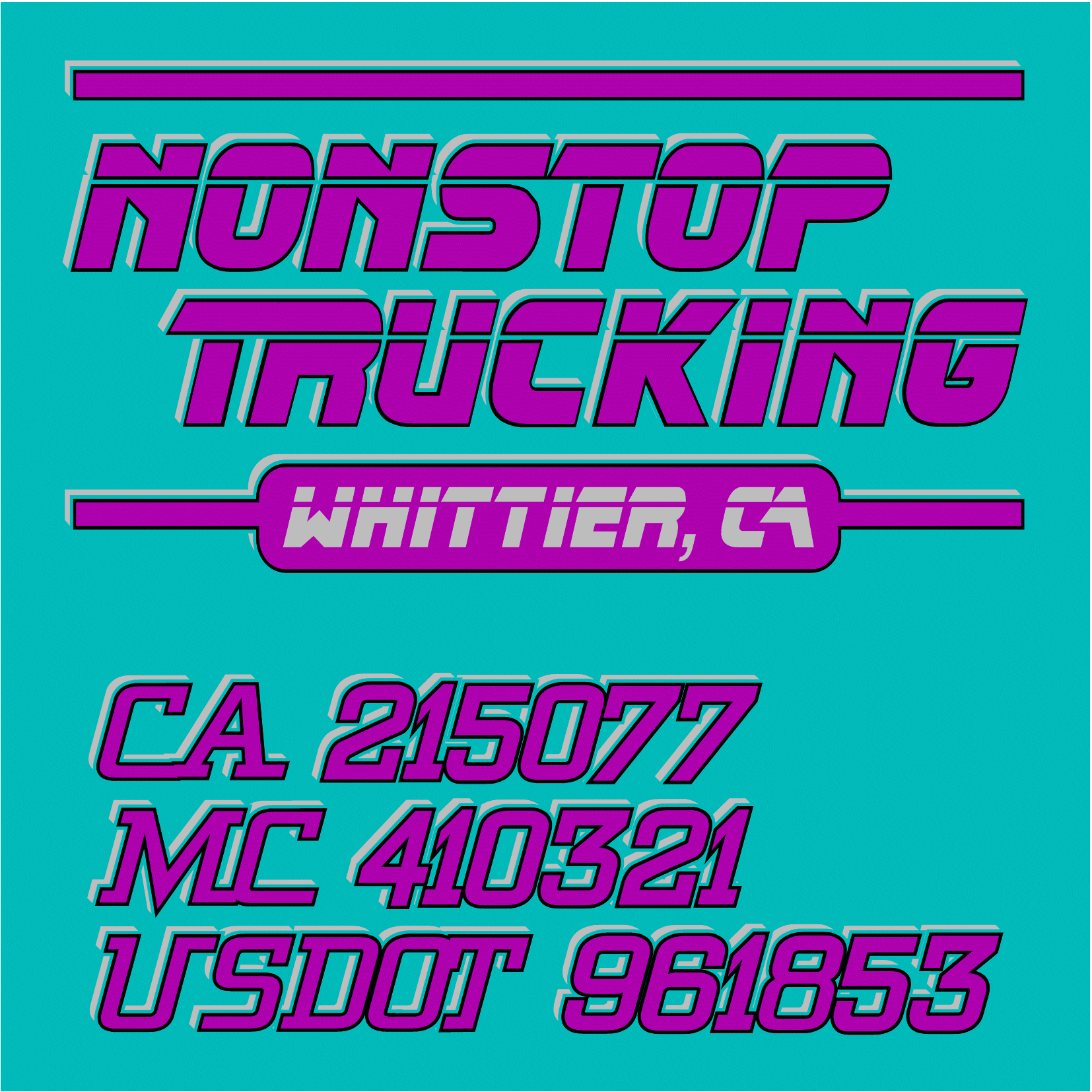 Sign Details: Custom Truck Lettering; Size 22″x22″; Colors royal purple – silver – black; Desired Fonts and Textroyal purple main color silver as upper left drop shadow black as outline font- bladerunner numbers- wideglide NONSTOP -1ST LINE atleast 4″tall Trucking -2nd line smaller than 1st line Whittier; CA -3rd line smaller than 2nd line *note numbers may be placed together on truck lettering or seperate. CA 215077 MC 410321 USDOT 961853
