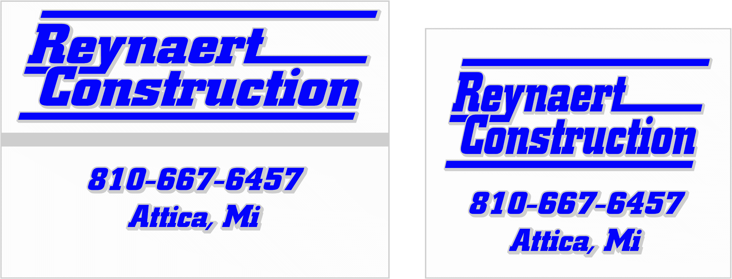 Sign Details: Custom Truck Lettering; Size 20 x 28; Colors blue lettering silver shadow; Desired Fonts and Text Font= Boroughs Text = Reynaert Construction 810-667-6457 Attica; Mi. These will be going on a dump truck door; I have an area 20 x 28 to safely work with; there is a feature line half way; so the sign will be going 10 inches up and down; the feature is only a half inch high. I would like the Reynaert Construction on 2 lines within the 10 inch top and the phone number 810-667-6457 and attica; Mi. on the lower 10 inches the attica; mi as in your examples can be smaller text. I also have an area on the tailgate 18w x 22h that I would like a separate quote; I need only one of these same text. the color of this one will be silver only. I also need to know what the delivery time is on something like this. I need these asap ( DOT is giving me a rough time) thanks you Randy Reynaert 810-667-6457