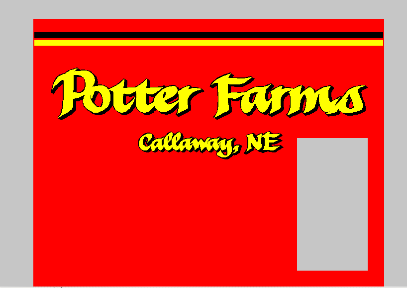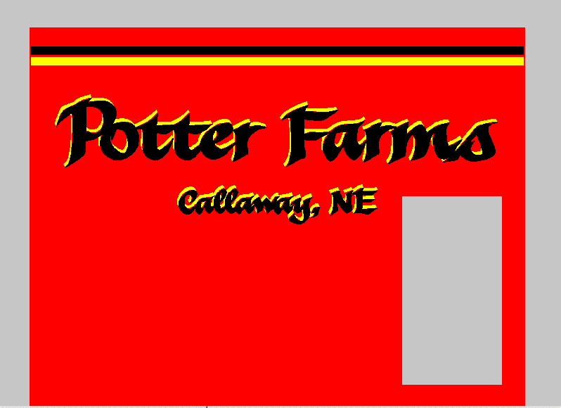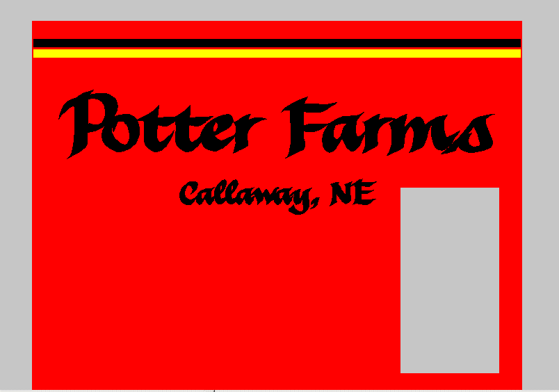 Sign Details: Custom Truck Lettering; Size10x20; Colors Black ; Desired Fonts and Text Potter Farms – in the Harvest Font; larger print in black; printed on top of circle Callaway; NE – in the Harvest Font in smaller print in black This lettering will go on my semi truck door; its a red door; with black and yellow pin sripe on top; so I think black will look fine. shown against a gray background