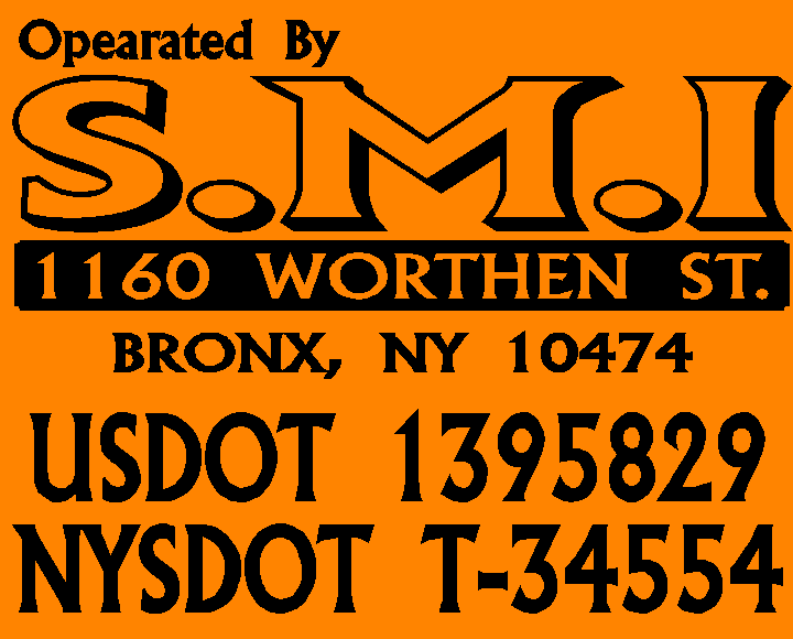 Custom Truck Lettering; Size24″;x36″ Colors orange background – black font; Desired Fonts and Text Opearated By S.M.I 1160 WORTHEN ST. BRONX; NY 10474 USDOT 1395829 NYSDOT T-34554