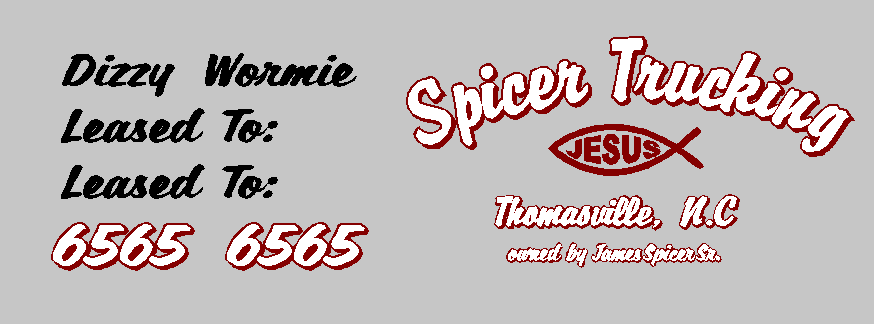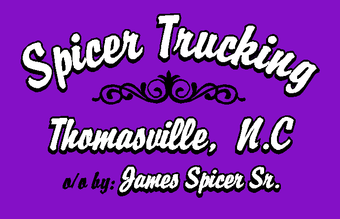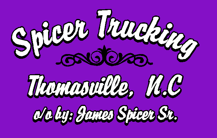 Desired Fonts and Text Font Brisk or Freehand 575 or Freehand 591 not sure which. Text line 1Spicer Trucking (5″ lettering; arched down with outline; and shadow drop down right in Black reflective) Text line 2Thomasville; N.C. (4″ lettering; straight across; center in-between the S and G in Spicer Trucking; with outline; and shadow drop down right in Black reflective) Test line 3o/o by:(2″ lettering in black reflective) Text line 3James Spicer Sr.(4″ lettering; with outline; and shadow drop down right in Black reflective)
