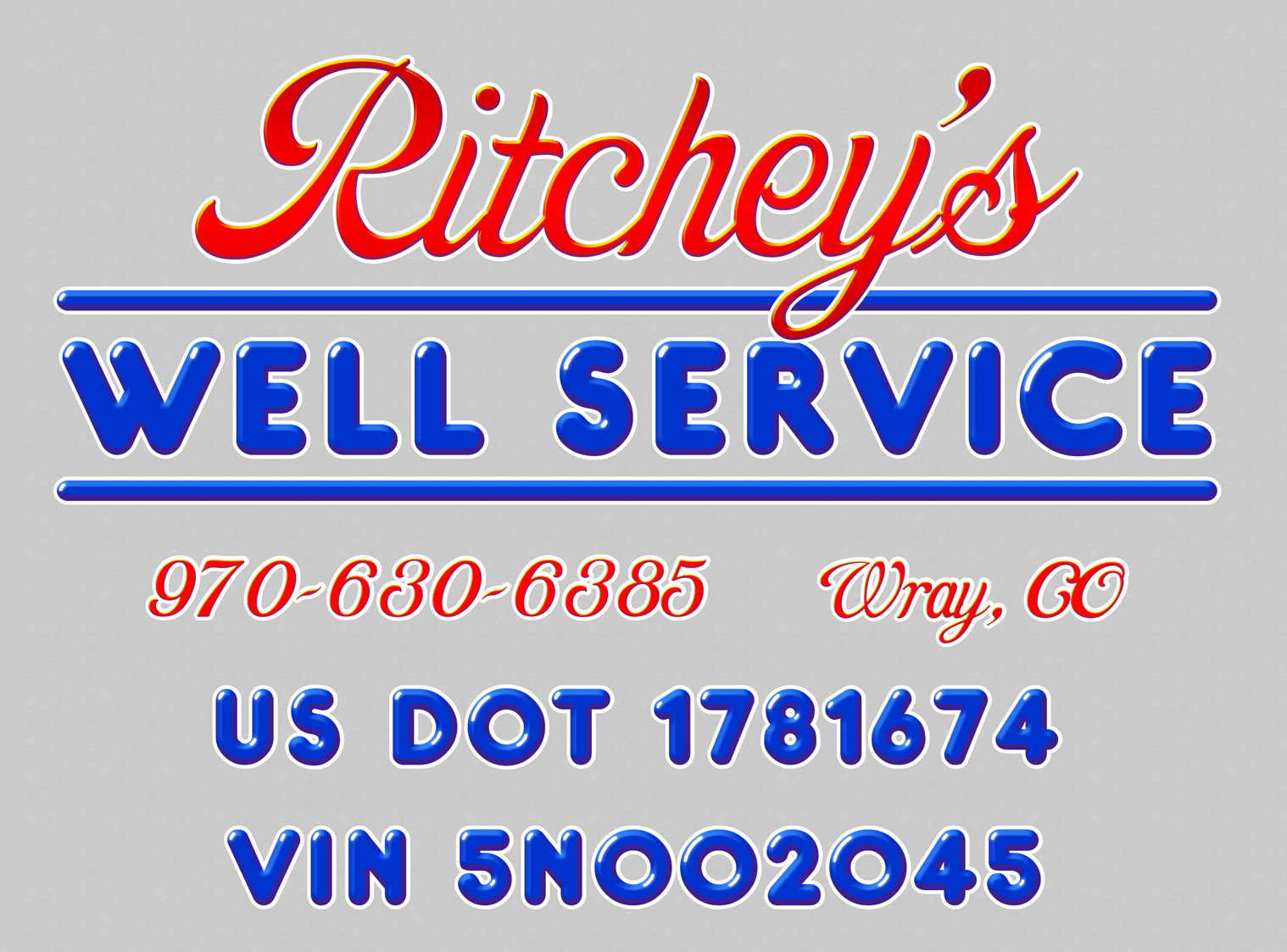 Type of Lettering Custom Truck Lettering; Size 14”high x 20” wide; Price 80; Colors gray lettering and white background; Desired Fonts and Text Ritchey’s Well Service 970-630-6385 Wray; CO US DOT 1781674 VIN 5N002045 You have 14″high x20″ wide Gray lettering and white backgound to work with. Can you come up with a few designs for me? Ritchey’s Well Service LLC 27510 CR 37 Wray co 80758 970-630-6385