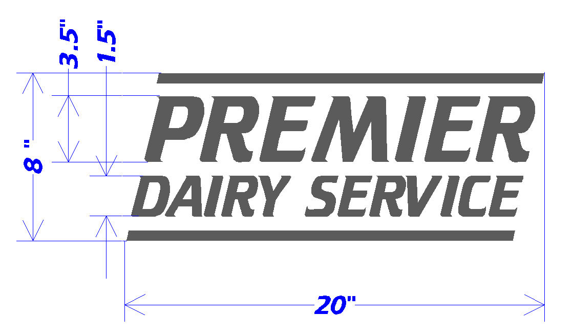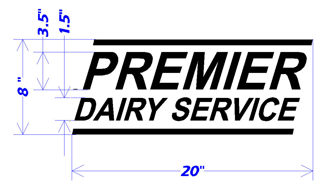 Type of Lettering Custom Truck Lettering; Size 8″ X 20″; Price60.00; Colors BLACK; Desired Fonts and Text In Arial Bold Font: PREMIER DAIRY SERVICE Would like PREMIER in larger letters – perhaps 3-4″ high. Would like DAIRY SERVICE directly under – perhaps 1-2″ high. Would like length of both to be about the same 16-20″.