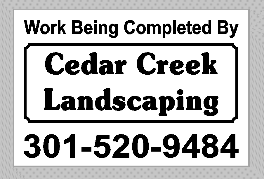 Corrugated Plastic Yard Sign: Size 12 inch by 18 inches; Colo rForest Green; Black; Desired Fonts and Text 301-520-9484 In Black under the following text in Forest Green; Work being completed by Cedar Creek Landscaping. Font= Broadside / Arial SIGN SHOULD LOOK LIKE THIS Work Being Completed By Cedar Creek Landscaping 301-520-9484 PLEASE make all text be at least 2 inches in height being proportional with length.