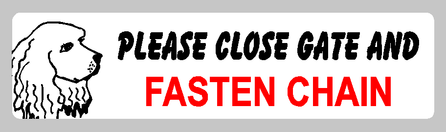 Sign Details: Metal Sign Color White; Size R or NR6 X 24 NR; Desired Fonts and Text PLEASE (Balloon; Black) CLOSE GATE AND (Arial Bold; RED) FASTEN CHAIN Can you insert black vinyl decal of cocker spaniel? shown against a gray background