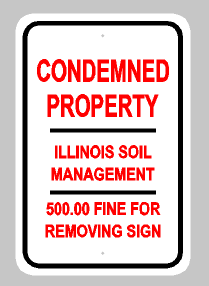 Sign Details: Metal Sign VINYL WORDED .063 ALUMINUM SIGN; Color WHITE; Size R or NR12X18; Desired Fonts and Text FONTS= ARIAL BOLD LETTER COLOR= RED LETTERING SIGN DESCRIPTION= CONDEMNED PROPERTY IL SOIL MANAGEMENT 500.00 FINE FOR REMOVING SIGN;
