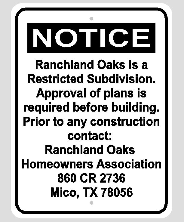 Sign Details- Type of Sign Vinyl Worded .080 Aluminum; Color White w/black lettering; Size R or NR18 x 24 R; Desired Fonts and Text Font Arial bold Text: NOTICE Ranchland Oaks is a Restricted Subdivision. Approval of plans is required before building. Prior to any construction contact the Ranchland Oaks Homeowners Association 860 CR 273 Mico; TX 78056 Description A total of 10 lines of text; centered left to right on an 18″ x 24″ aluminum traffic sign. The word “NOTICE” should be in all caps and slightly larger than the other text.