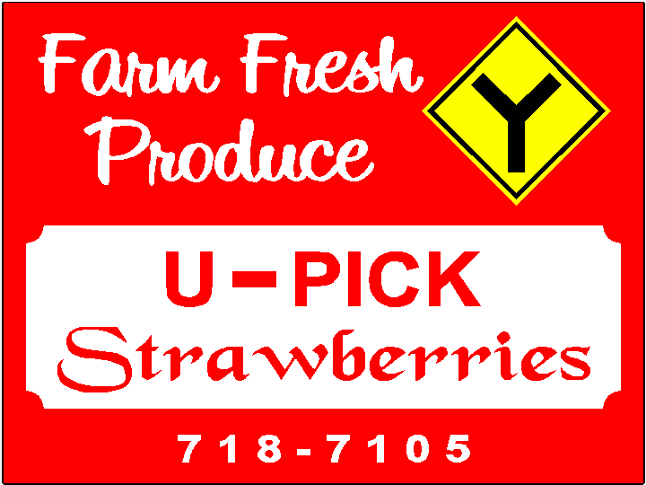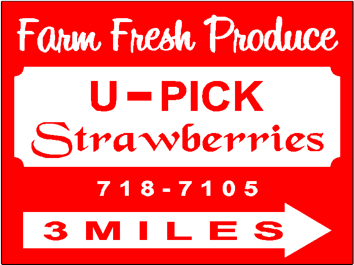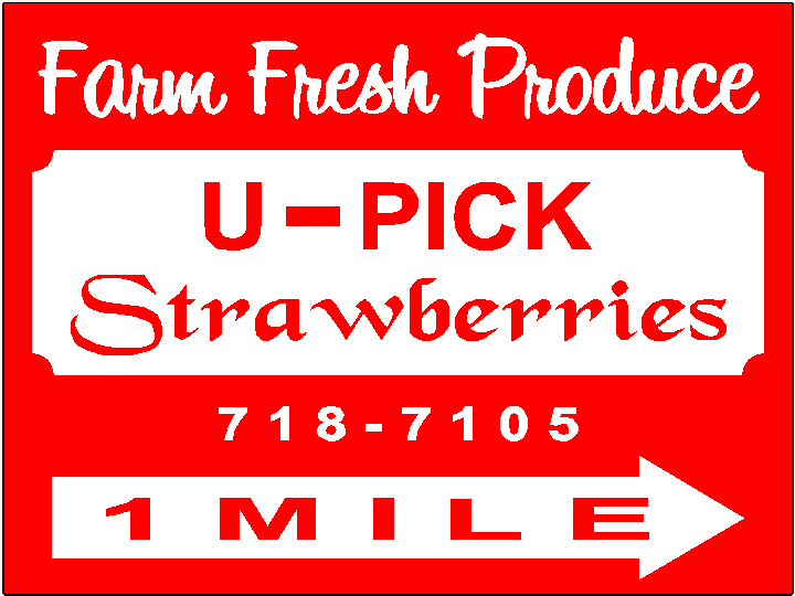 Product = Metal Yard Sign Options = Type of SignCustom Yard Sign; Size18x24 2 sided Sign; Price34.95; ColorsRed Background with White Lettering; Desired Fonts and TextFont Each line marked 5 line text: We need three different signs. The first two signs will have 5 lines as follows: Farm Fresh Produce(Bean Sprout Font) U – Pick (Arial Bold) Strawberries (Black Chancery) 718-7105 (Arial Bold) 1 mile (With arrow pointing right on one side and left on reverse side.)(Arial Bold) We also want a second sign same as above but with “3 miles” and arrows. Same font types as above sign. May change after seeing the sign; of course or seeing your design. We want to create a sign on which we can easily cover the third line (strawberries) with other produce that comes in season. Can you make an insert or covering stip to put over top of the word strawberries? We want to replace strawberries with “blackberries” and then later with “sweet corn” and later with “cantelope” . A third sign designed as follows: Farm Fresh Produce (Bean Sprout) U – Pick (Arial Bold) Strawberries (Black Chancery) 718-7105 (Arial Bold) A large “Y” shaped arrow pointing drivers to both right and left fork of the road. (Arial Bold)