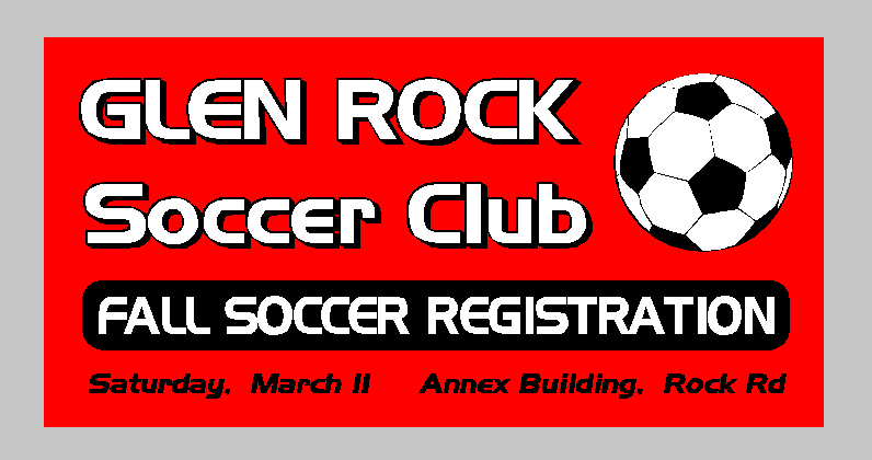 Banner Details: Size 4 x 8; Colors Red (background); White and/or Black (lettering); Desired Fonts and Text Glen Rock Soccer Club (97. Areo Extended ) Fall Soccer Registration (97. Areo Extended ) Saturday; March 11 (97. Areo Extended ) Annex Building; Rock Rd (97. Areo Extended ) (Large Soccer Ball somewhere on the sign?)