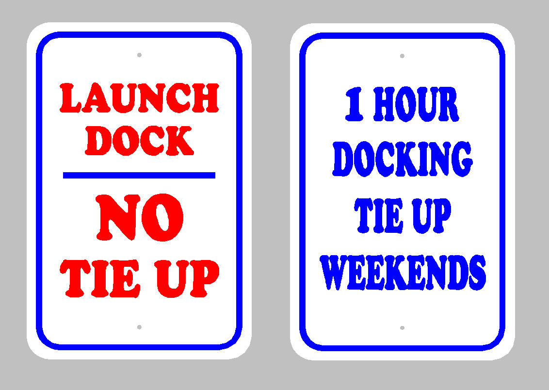 Type of Sign Vinyl Worded .063; Color White; Size R or NR12 * 18 reflective; Desired Fonts and Text Broadside Front in red LAUNCH DOCK NO TIE UP Blue stripping around edge of signs; Type of Sign Vinyl Worded .063; Color White; Size R or NR12 * 18 reflective; Desired Fonts and Text Broadside Blue lettering 1 HOUR DOCKING TIE UP WEEKENDS BLUE STRIPPING AROUND SIGN;