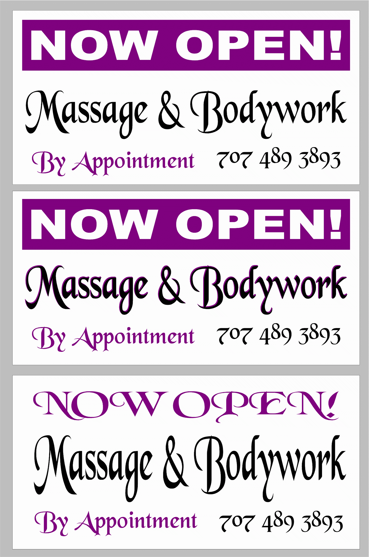 Sign Details: Size 3×6; Colors Purple; Black; Purple; Black; Desired Fonts and Text NOW OPEN! (In all CAPS) (purple) Black Chancery Font Massage & Bodywork (Black) By Appointment (purple) 707 489 3893 (Black)