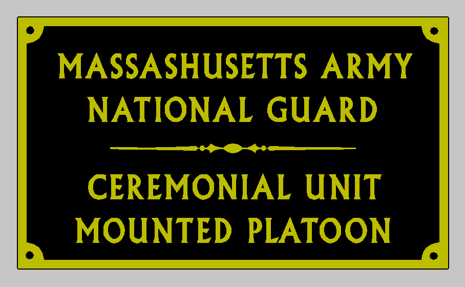 Magnetic Sign Details: Size14 inches by 24 inches Set of 2 Magnetics; Colors Black and Gold; Desired Fonts and Text ALL LETTERS IN FONTFLAIR AND AS LARGE AS THEY’LL FIT ALL LETTERS IN UPPER CASE IF POSSIBLE- BACKGROUND BLACK WITH LETTERING GOLD AND GOLD BOARDER. TO READ: MASSASHUSETTS ARMY NATIONAL GUARD CEREMONIAL UNIT MOUNTED PLATOON