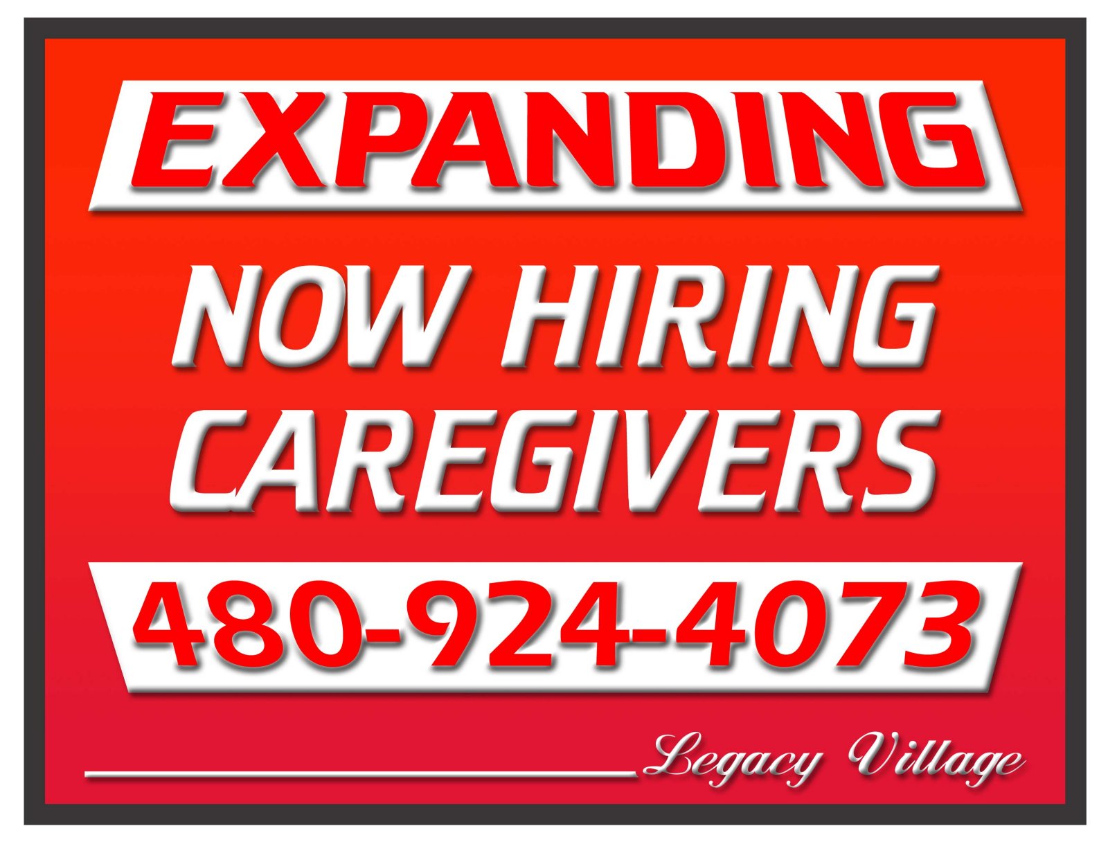 Sign Details: Type of Sign Custom Yard Sign; Size 18×24 2 sided Sign; Colors Red background with White Lettering; Desired Fonts and Textlarge and taking most of the sign is the expanding now hiring caregivers and the phone number; legacy village can be smaller at the bottom of the sign so long as it is also legible. “EXPANDING NOW HIRING CAREGIVERS” Cruiser Font 480-924-4073 Cuiser Font “Legacy Village” Smaller and at the bottom in Fancy Font