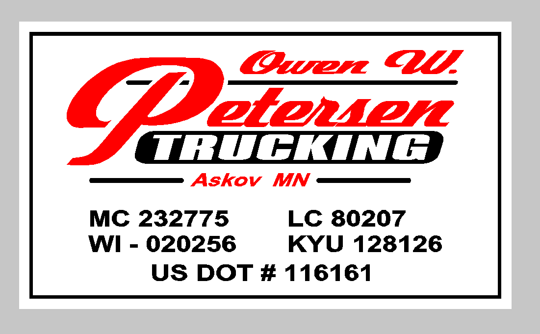 Sign Details: Magnetic Door Signs Options = Size 14 inches by 24 inches Set of 2 Magnetics; Colors red; Desired Fonts and Text Font Broadside Text Owen W. Petersen Trucking Askov MN MC 232775 US DOT # 116161 WI – 020256 LC 80207 KYU 128126