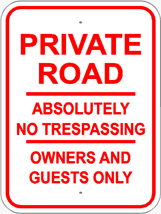 Desired Fonts and Text Red lettering: Font:Airial Bold Text PRIVATE ROAD ABSOLUTELY NO TRESPASSING Owners and Guests Only