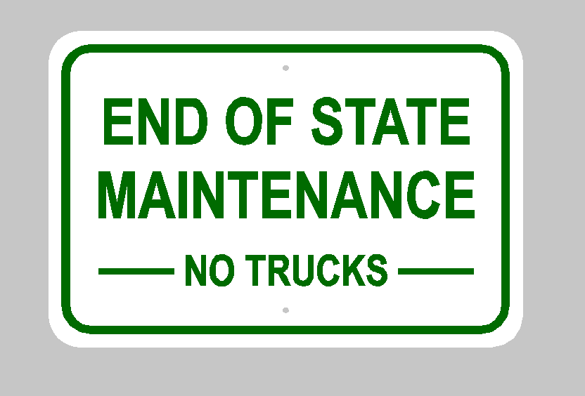 Sign Details: Metal Sign – Type of Sign:Traffic; Color White ; Size R or NR12x18 R; Desired Fonts and Text Forest Green text; Arial BOLD. Please center all lettering on sign. Other sizes are acceptable if lettering will fit better. (This sign will be placed at the end of our driveway to keep trucks and state maintenance vehicles off our private drive.) END OF STATE MAINTENANCE —– NO TRUCKS