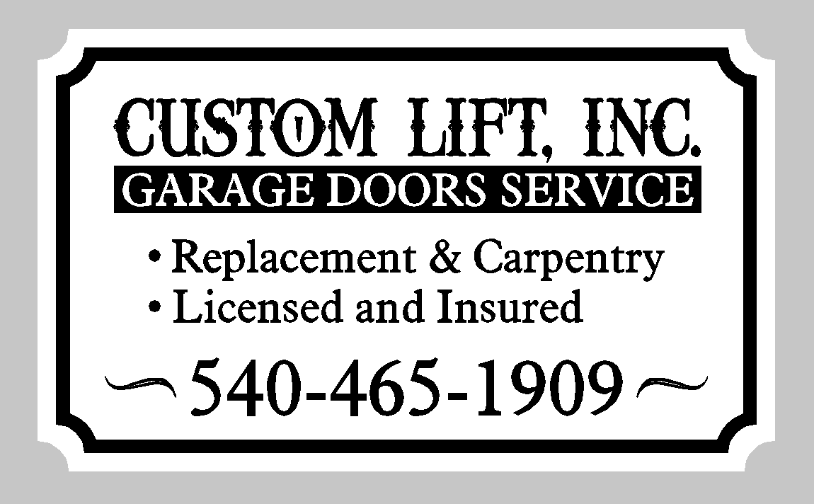 Sign Details: Magnetic Door Signs Options = Size 12 inches by 20 inches Set of 2 Magnetics; Colors White Background and Black Letttering; Desired Fonts and Text Font to be Matilda for Company Name Custom Lift; Inc. (Matilda) Large Text Garage Doors Service; Replacement & Carpentry ( Times New Roman Bold) Licensed and Insured ( Times New Roman Bold) 540-465-1909 ( Times New Roman Bold) shown against a gray background