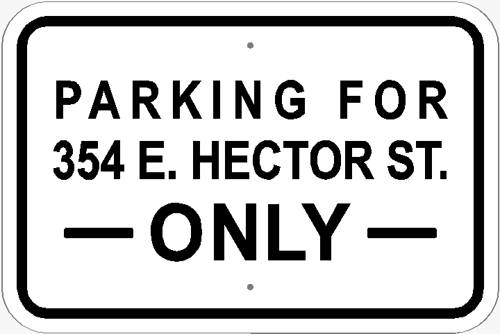 The sign should be 18″ wide and 12″ high. I want the following text on the sign. “Parking for 354 E. Hector St. ONLY” Please have the “ONLY” on the bottom line by itself and in Capital and bold letters. Questions I can be reached at 215-696-8587;