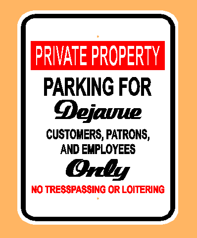 Sign Details: Metal Sign vinyl worded .080 aluminum; Color white; Size R or NR18x24; Desired Fonts and Text PRIVATE PROPERTY NO TRESSPASSING OR LOITERING PARKING IS FOR DEJAVUE CUSTOMERS PATRONS AND EMPLOYEES ONLY
