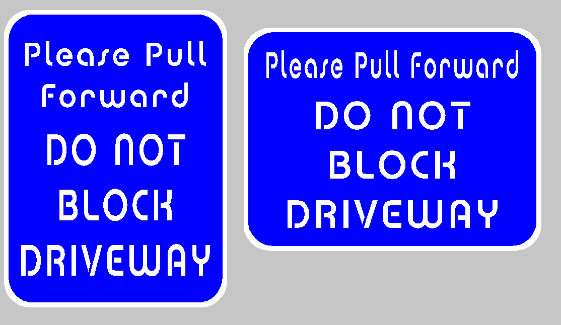 Sign Details- Type of Sign 18″ X 24″, Color blue background, Size R or NR NR, Desired Fonts and Text White letters – CHARLET “Please Pull Forward – DO NOT BLOCK DRIVEWAY” GREY IS FOR VIEWING PURPOSES ONLY