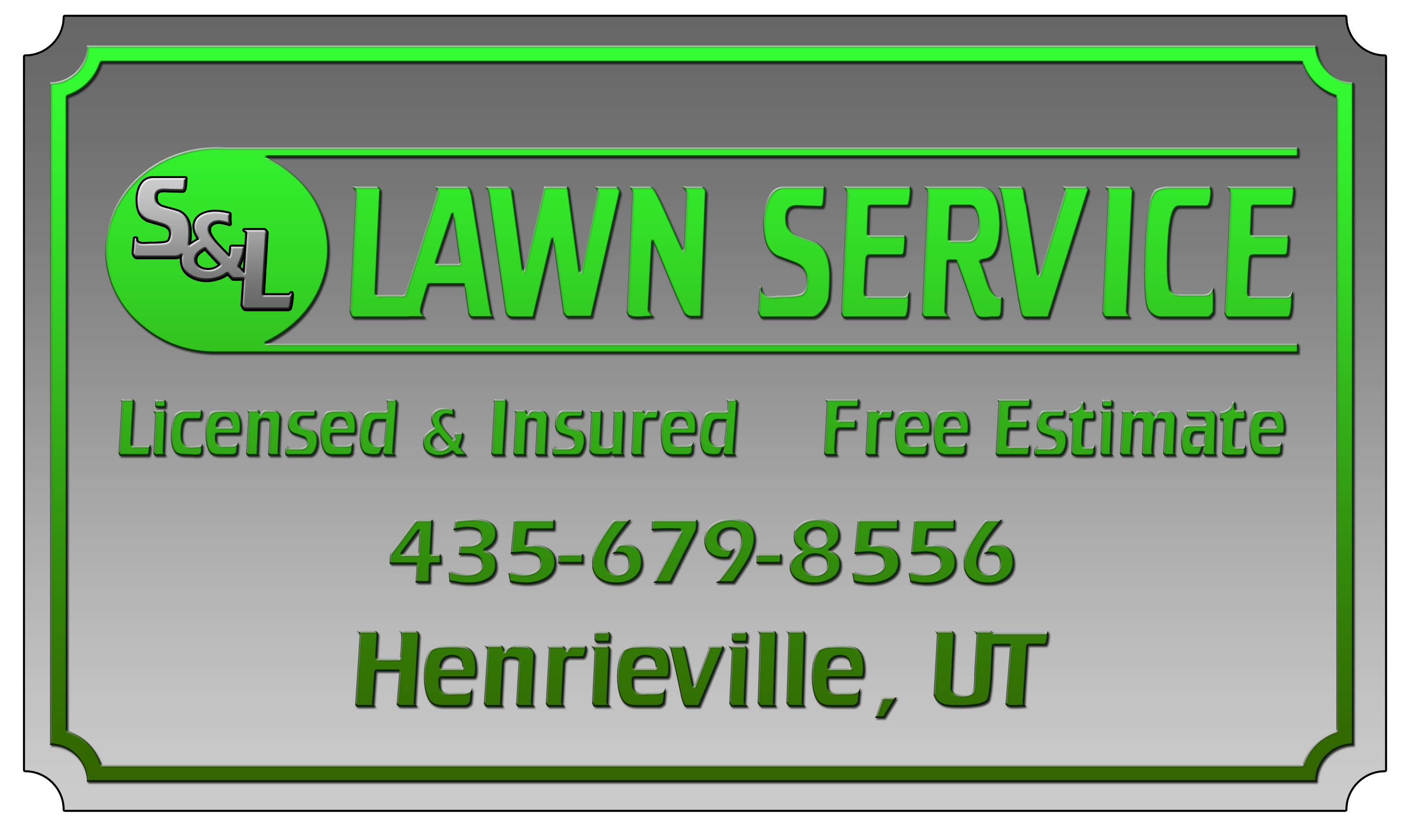 Sign Details: Size 14 inches by 24 inches Set of 2 Magnetics; Colors Silver and Apple Green; Desired Fonts and TextBrewers Font S & L Lawn Service Licensed & Insured Free Estimate 435-679-8556 Henrieville, UT