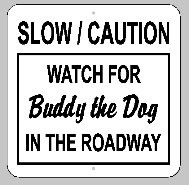 Sign Details: Desired Fonts and Text Slow/Caution Watch for Buddy the Dog in the Roadway