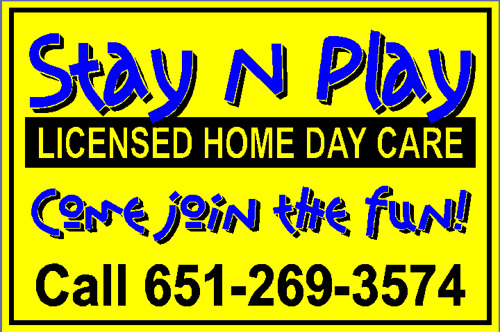 Desired Fonts and Text line 1 Stay N Play (Amazon Font; Blue color) line 2 Licensed Home Day Care (Arial Bold font; Black color) line 3: Come join the fun! (Amazon Font; Blue color) line 4: Call 651-269-3574 Arial Bold Font; Black color